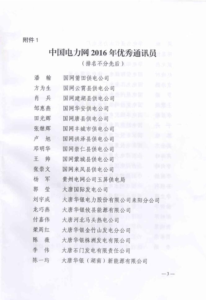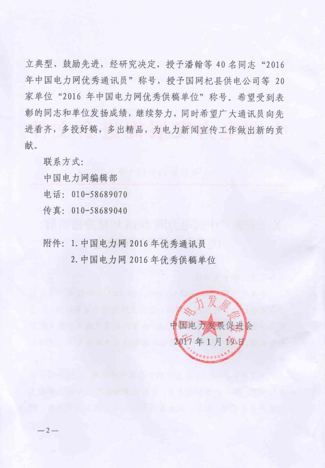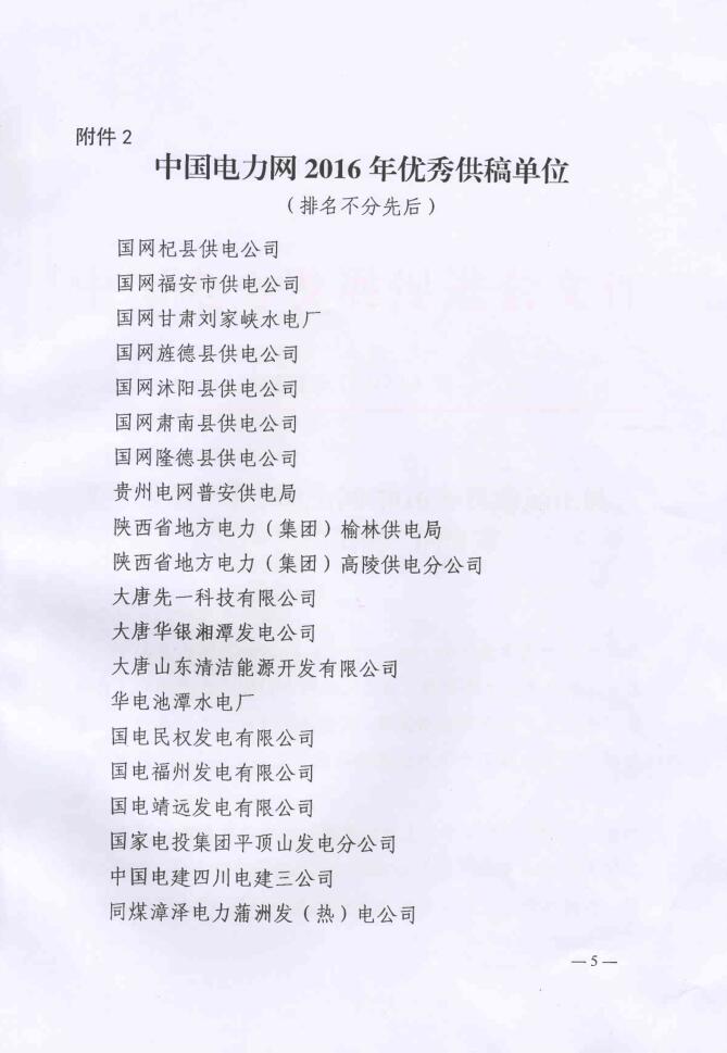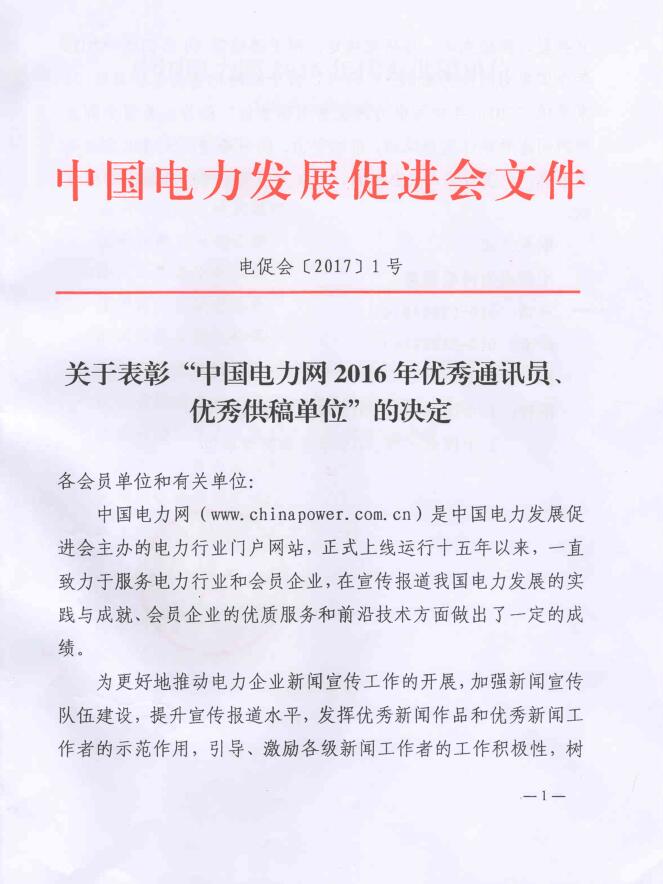 關(guān)于表彰“中國電力網(wǎng)2016年優(yōu)秀通訊員、優(yōu)秀供稿單位”的決定
