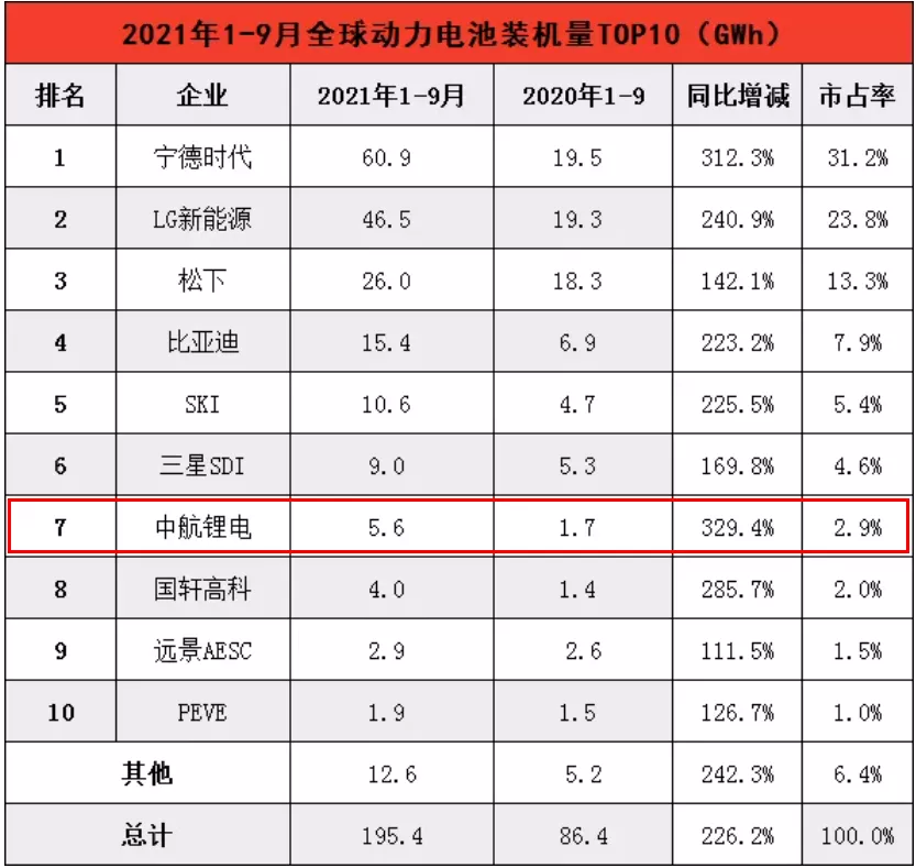 在10月底韓國市場研究機構(gòu)SNE Research公布的2021年1-9月全球動力電池裝車量排行榜中,中航鋰電以5.6GWh的動力電池裝車量,位居第七。