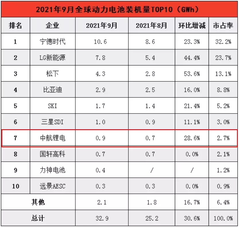 而從9月單月全球動力電池裝車量排行榜來看,裝車量為0.9GWh、仍排名第七的中航鋰電,距離排名第六、裝車量為1GWh的韓國三星SDI僅差距0.1GWh。
