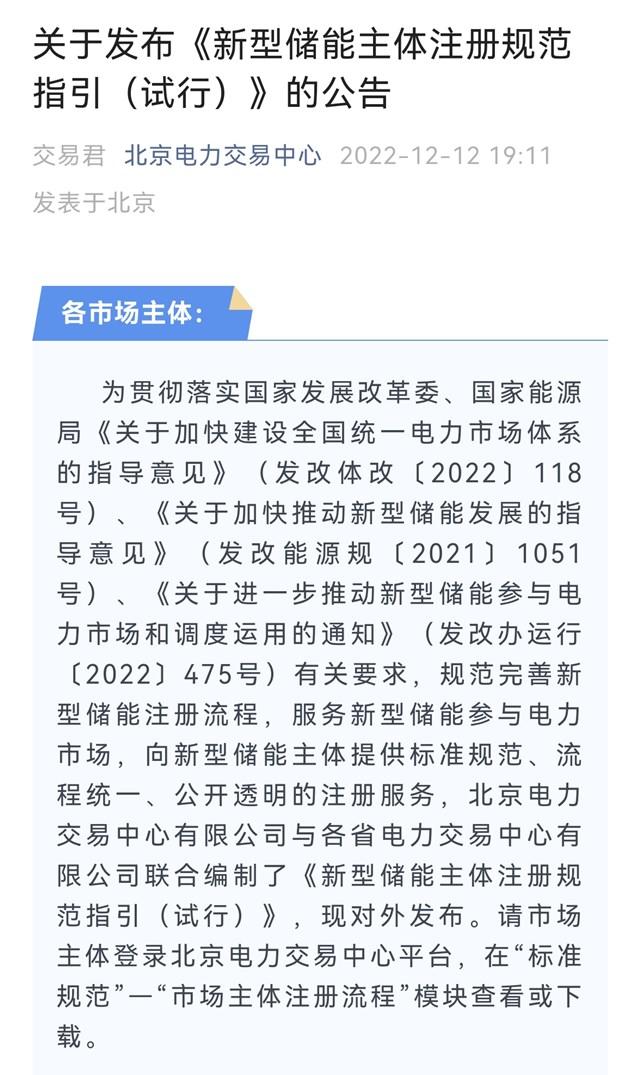 12日晚,北京市電力交易中心發(fā)布《新型儲能主體注冊規(guī)范指引(試行)》公告(下稱《指引》)。這是交易機構(gòu)首次從實施層面統(tǒng)一明確將新型儲能作為獨立于發(fā)電企業(yè)、售電公司和用戶的注冊類型,并且規(guī)范了詳細(xì)的注冊程序與所需信息、資料。
