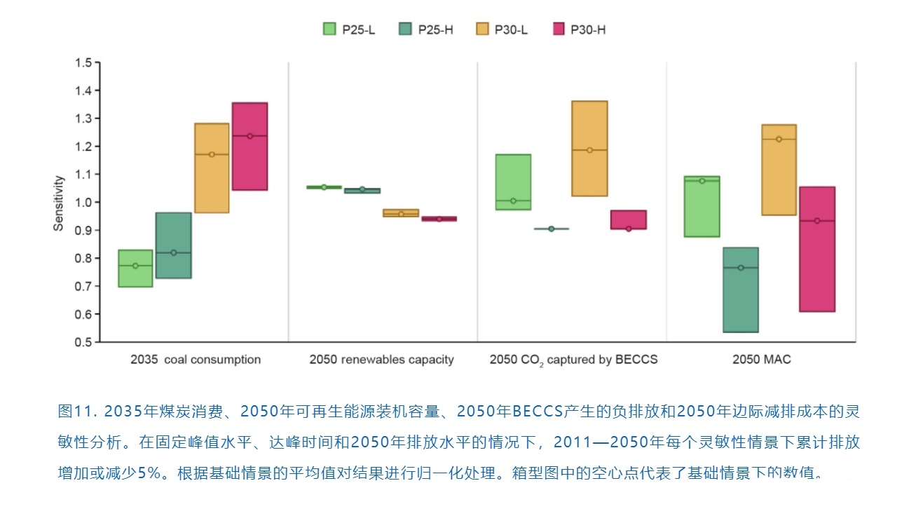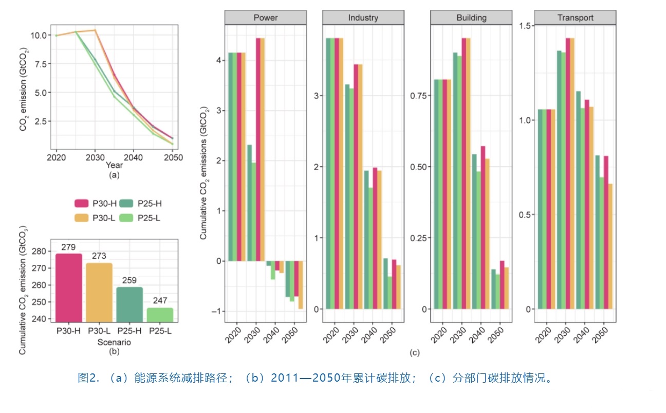 通過(guò)多情景比較發(fā)現(xiàn),提前達(dá)峰能夠給中國(guó)更多的時(shí)間來(lái)安排煤電廠的有序退役和可再生能源的平穩(wěn)部署。雖然提前達(dá)峰在短期內(nèi)可能會(huì)有更大的轉(zhuǎn)型壓力,但從長(zhǎng)遠(yuǎn)來(lái)看,這是最具有成本效益的選擇。同時(shí),提前達(dá)峰帶來(lái)的累計(jì)排放量減少,也將縮小21世紀(jì)下半葉對(duì)于負(fù)排放的大量需求。盡管4個(gè)情景2050年局地空氣污染物的排放差異不大,但是提前實(shí)現(xiàn)碳達(dá)峰將導(dǎo)致未來(lái)15年的空氣質(zhì)量得到明顯改善。2050年更低的排放值會(huì)增加整體的減排壓力,這將導(dǎo)致可再生能源和負(fù)排放技術(shù)的進(jìn)一步擴(kuò)張。需求部門在能源轉(zhuǎn)型中也將通過(guò)減少能源需求(但增加福利損失)、使用高成本技術(shù)(大規(guī)模使用氫能)等策略來(lái)應(yīng)對(duì)更為嚴(yán)格的排放約束。