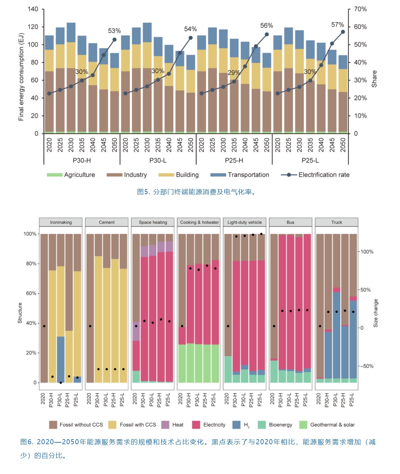 產(chǎn)業(yè)結(jié)構(gòu)調(diào)整、能源效率提高和清潔燃料替代是能源需求部門能耗和排放下降的三大支柱。據(jù)估計(jì),第二產(chǎn)業(yè)在國(guó)民經(jīng)濟(jì)中的比重逐年下降,到2050年,這一比重將比2020年減少約9%,而第三產(chǎn)業(yè)比重將增加10%。如圖5所示,對(duì)于P30情景,中國(guó)的終端能源消費(fèi)將在2030年以125 EJ達(dá)峰,而對(duì)于P25情景,達(dá)峰時(shí)間將提前到2025年左右,峰值水平也略低(119 EJ)。兩組情景都顯示,2050年中國(guó)終端能源消費(fèi)將穩(wěn)定在90 EJ左右。未來(lái)的30年,電氣化率將持續(xù)上升,從目前的23%增加到2035年的30%,然后加速達(dá)到2050年的近60%。技術(shù)進(jìn)步和終端能源的電氣化推動(dòng)能源效率的快速提高。在圖6中,部分能源服務(wù)需求的規(guī)模以及技術(shù)占比變化以圖表的形式展示。