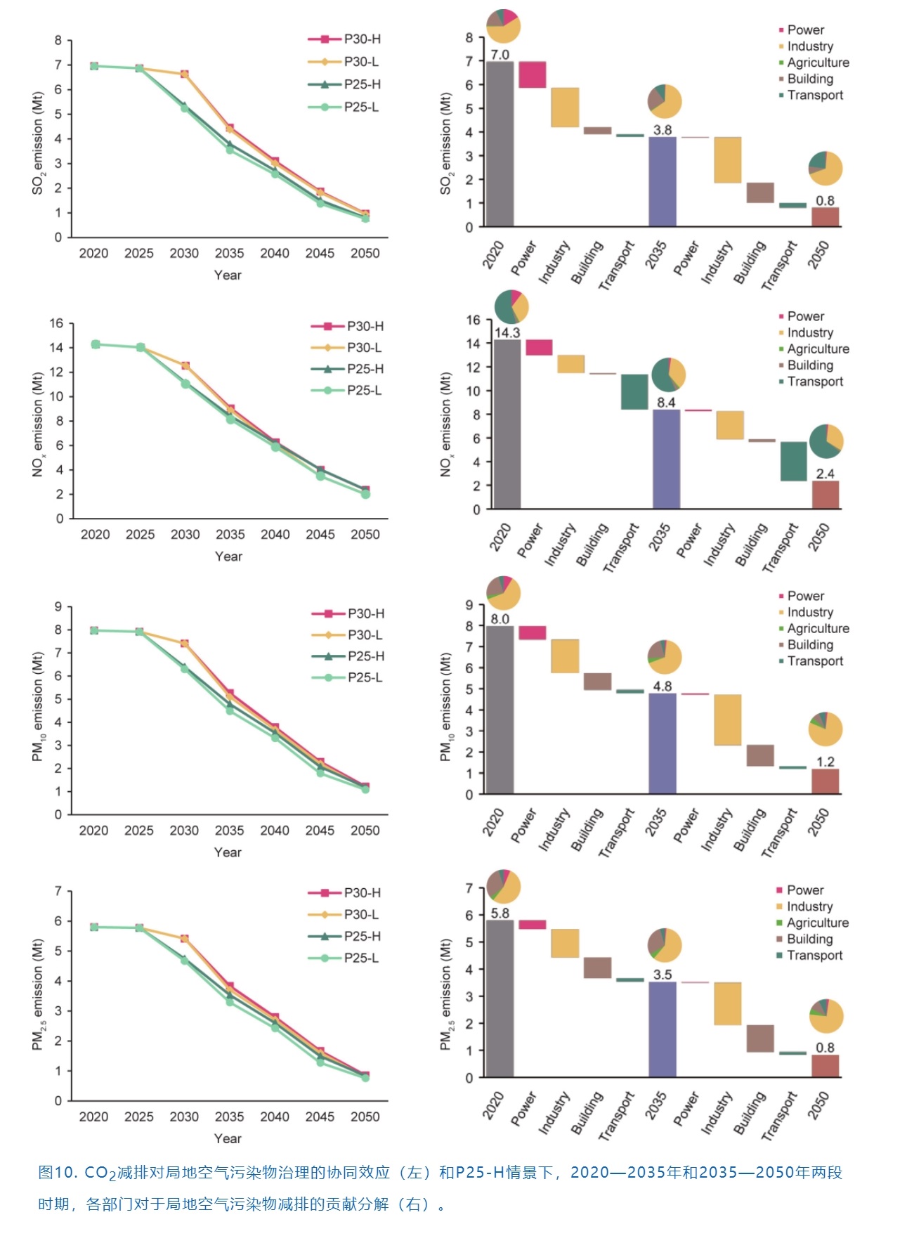 對(duì)比不同情景,在2025—2035年,上述4種局地污染物的排放在碳達(dá)峰時(shí)間不同的情景下會(huì)有明顯的不同。與P30情景相比,P25情景在2030年的SO2、NOx、PM10、PM2.5排放分別減少21%、12%、15%和14%。因此,盡管不同情景下2050年的排放趨于一致,盡早開(kāi)始碳減排都將產(chǎn)生更多的近期收益。