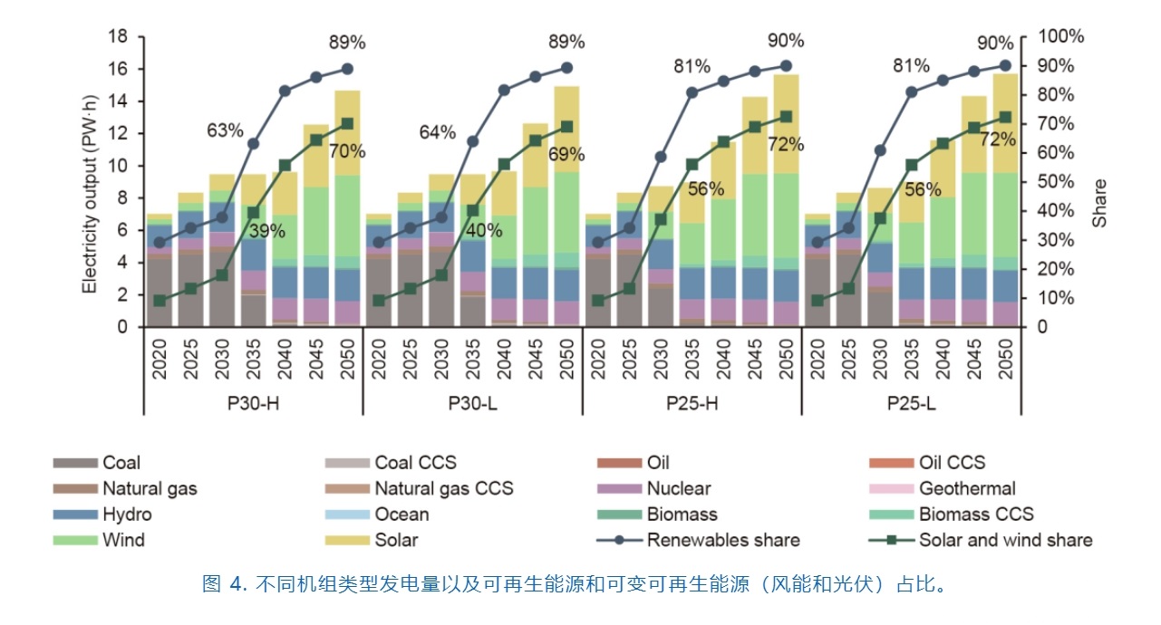 發(fā)電結(jié)構(gòu)的變化主要是因?yàn)槊弘姀S的退役和風(fēng)能及光伏發(fā)電的增加??梢灶A(yù)計(jì),煤電廠將很快進(jìn)入轉(zhuǎn)型最關(guān)鍵的10年。在此期間,煤電廠要么需要提前退役,要么將進(jìn)行靈活性改造以進(jìn)入輔助服務(wù)市場(chǎng),或者轉(zhuǎn)變?yōu)樯镔|(zhì)-煤混燃電廠甚至純BECCS電廠,從而能夠產(chǎn)生負(fù)排放。研究表明,碳達(dá)峰的時(shí)間在很大程度上取決于燃煤電廠退出發(fā)電序列的速度。比較P25和P30情景,發(fā)現(xiàn)近期需要盡快停止新建煤電廠并在合理范圍內(nèi)讓落后煤電廠有序退役。到燃煤電廠基本退出后,可再生能源發(fā)電量將占總發(fā)電量的81%,而以風(fēng)能和光伏為代表的可變可再生能源的比例將達(dá)到56%。對(duì)于P25情景,風(fēng)能和光伏的總裝機(jī)容量在2035年將達(dá)到3.1 TW,而對(duì)于P30情景,風(fēng)能和光伏在2040年的總裝機(jī)容量為3.4 TW。核能將成為電力系統(tǒng)的重要組成部分,未來(lái)可再生能源的滲透率會(huì)很高,其裝機(jī)容量將在未來(lái)20年增長(zhǎng)3倍以上。