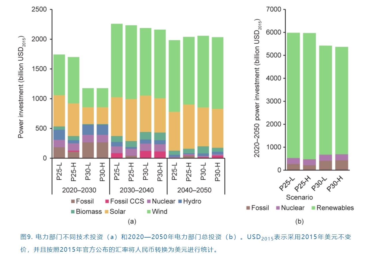 中國(guó)持續(xù)的清潔能源投資為低碳轉(zhuǎn)型提供了堅(jiān)實(shí)的基礎(chǔ)。為了實(shí)現(xiàn)中國(guó)的碳中和目標(biāo),需要大幅擴(kuò)大低碳投資規(guī)模,并不斷提高綠色投資比重。如圖9所示,從現(xiàn)在到2050年,大約需要6萬(wàn)億美元的電力投資來(lái)支持電力系統(tǒng)的低碳轉(zhuǎn)型,其中可再生能源投資約占90%??偟膩?lái)說(shuō),不同的碳中和時(shí)間對(duì)于電力行業(yè)的投資額影響不大,但不同的碳達(dá)峰時(shí)間對(duì)其投資有較大影響。未來(lái)10年是能源轉(zhuǎn)型和升級(jí)的重要窗口期,P25情景下,電力部門年均投資額超過(guò)1700億美元,而P30情景下投資額則不足1200億美元。最大的投資缺口在于風(fēng)能和太陽(yáng)能發(fā)電技術(shù),預(yù)期P25情景(超過(guò)1.2萬(wàn)億美元)近十年的風(fēng)能和太陽(yáng)能投資是P30情景的兩倍。如果在2030年前沒(méi)有采取強(qiáng)有力的行動(dòng),則在未來(lái)10年可能還會(huì)新建大量未加裝CCS技術(shù)的火力發(fā)電廠,從而增加了碳鎖定和資產(chǎn)擱置的風(fēng)險(xiǎn)。2030年以后,每年仍將有超過(guò)2000億美元的電力投資,而沒(méi)有加裝CCS的火力發(fā)電廠將幾乎不再發(fā)展。