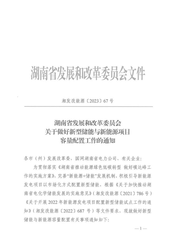 湖南省發(fā)改委下發(fā)做好新型儲(chǔ)能與新能源項(xiàng)目容量配置工作的通知