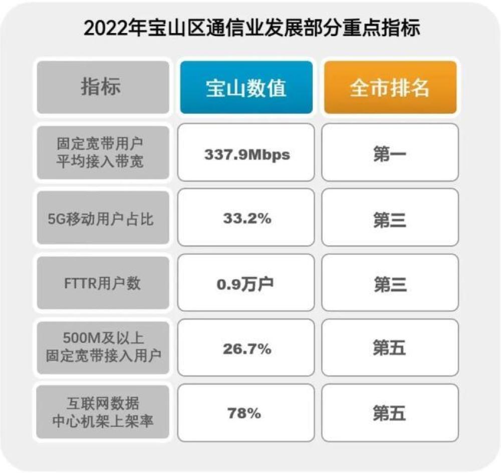 近日,市通信管理局發(fā)布《2022年上海市各行政區(qū)通信業(yè)發(fā)展重點指標》,該指標共計8項,寶山5項指標進入全市前五,其中,寶山固定寬帶用戶平均接入帶寬位列全市第一,5G移動用戶、FTTR用戶數(shù)占比排名全市第三。