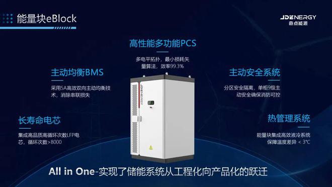 基于“all in one”的產(chǎn)品化設(shè)計理念,奇點能源能量塊eBlock創(chuàng)新性地將長壽命電芯、高效均衡BMS、高性能多功能PCS、主動安全系統(tǒng)、高效熱管理系統(tǒng)融于單個戶外布署機柜,形成了一體化的智慧能量塊產(chǎn)品eBlock,為電化學(xué)儲能行業(yè)提供了一種全新的解決方案。其真正做到了把儲能工程轉(zhuǎn)化為標準化產(chǎn)品,定義了儲能系統(tǒng)集成新標準。