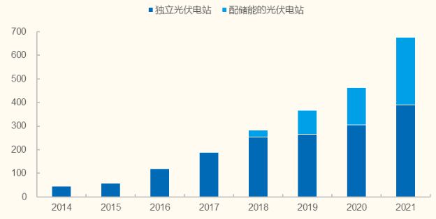 圖:2018年開(kāi)始申請(qǐng)并網(wǎng)的光伏電站中光伏+儲(chǔ)能的占比顯著增加(GW)