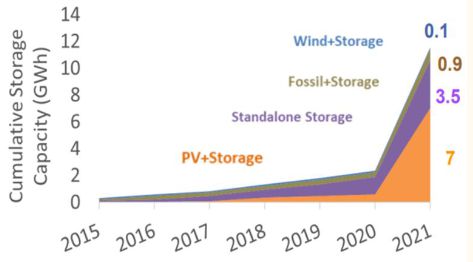 2020年之前美國(guó)表前市場(chǎng)以獨(dú)立儲(chǔ)能為主,隨著光伏裝機(jī)中儲(chǔ)能滲透率的提高, 2021年存量?jī)?chǔ)能裝機(jī)中光伏+儲(chǔ)能項(xiàng)目占比達(dá)到61% ,預(yù)計(jì)未來(lái)這一占比將繼續(xù)提升。