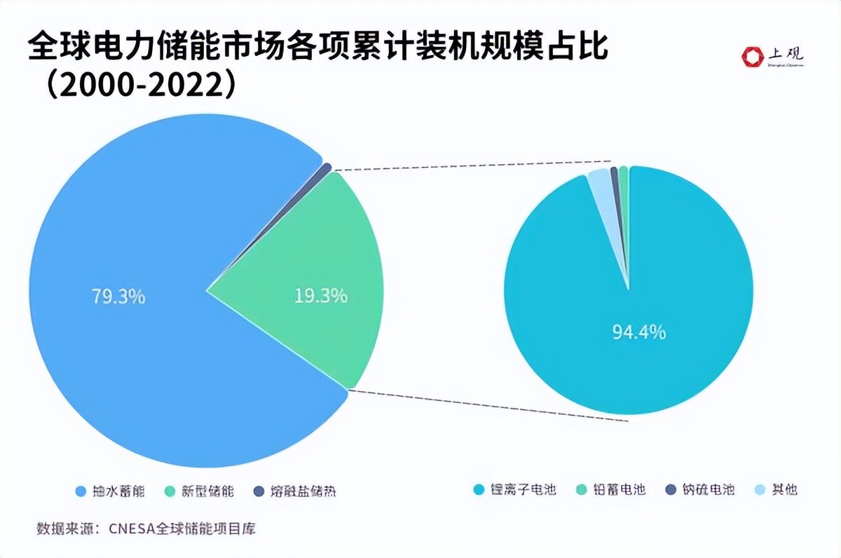 傳統(tǒng)儲能產(chǎn)業(yè)大多利用水勢高低差進(jìn)行抽水蓄能,這也是目前全球儲能的主要方式,占比近八成。但抽水蓄能受地理資源約束明顯,一般只能建造在山區(qū)與丘陵地帶,且建造成本高、時(shí)間長。隨著新能源產(chǎn)業(yè)的不斷發(fā)展,以鋰電池儲能為代表的新型儲能產(chǎn)品技術(shù)逐漸成熟、成本下降,迎來了大規(guī)模商業(yè)化的時(shí)機(jī)。