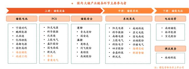 大儲(chǔ)產(chǎn)業(yè)鏈主要包括上游儲(chǔ)能設(shè)備、中游系統(tǒng)集成、下游電站等環(huán)節(jié)。儲(chǔ)能電池和PCS是大儲(chǔ)產(chǎn)業(yè)鏈價(jià)值量最大的兩個(gè)環(huán)節(jié),陳驍?shù)热苏J(rèn)為,儲(chǔ)能電池絕對(duì)龍頭寧德時(shí)代,第二梯隊(duì)比亞迪、鵬輝能源、億緯鋰能、國(guó)軒高科、南都電源、海辰儲(chǔ)能等有望借國(guó)內(nèi)大儲(chǔ)市場(chǎng)加速贏得動(dòng)力電池之外的第二成長(zhǎng)曲線。國(guó)內(nèi)大儲(chǔ)PCS頭部企業(yè)陽(yáng)光電源、科華數(shù)據(jù)、上能電氣、盛弘股份、國(guó)電南瑞、新風(fēng)光等在裝機(jī)提速+毛利改善下業(yè)績(jī)有望受益。