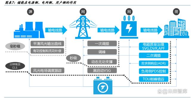 電源側(cè):1)平滑、調(diào)峰作用:由于光伏、風(fēng)電、水電的隨機性、波動性特征, 電源側(cè)需要儲能以實現(xiàn)電力從秒級到季度的供需平衡;2)黑啟動:借助儲能電 量帶動無自啟動能力發(fā)電機組。
