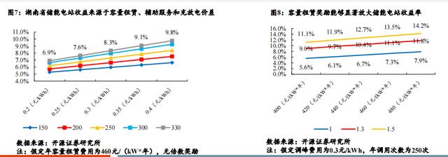 并且在容量租賃獎勵為1.3倍和1.5倍時,其資本金收益率能夠放大至11.1%與13.5%。考慮到當(dāng)前湖南省仍存在較大的電 網(wǎng)側(cè)儲能裝機(jī)缺口,調(diào)峰服務(wù)輔助頻次和價格均有望實(shí)現(xiàn)較大的提升,在不考慮容量租賃獎勵的情況下,其資本金收益在年調(diào)用次 數(shù)為330次,調(diào)峰輔助服務(wù)收益為0.4元/kWh的情況下,其資本金收益率能夠達(dá)到9.8%。隨著電力輔助服務(wù)種類增多和電力現(xiàn)貨市場 的開展,其收益方式有望進(jìn)一步增加。同時儲能電站的收益在一定程度上依賴電站運(yùn)營商自身的運(yùn)營水平,隨著儲能電站運(yùn)營商的 經(jīng)驗(yàn)積累,收益能力有望進(jìn)一步提升。