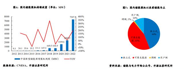 國內(nèi)儲能裝機(jī)有望持續(xù)增長,表前儲能為裝機(jī)主力。根據(jù)CNESA數(shù)據(jù)統(tǒng)計,2012-2022年間國內(nèi)新型儲能新增裝機(jī)復(fù)合增 速高達(dá)95%。2022年國內(nèi)新型儲能新增裝機(jī)高達(dá)7.3GW,同比增長近200%。就國內(nèi)儲能裝機(jī)類型分布而言,根據(jù)儲能與 電力市場公眾號統(tǒng)計,可再生能源配儲與獨(dú)立儲能裝機(jī)占比分別為45%與44%,用于調(diào)頻的裝機(jī)占比僅為1%,工商業(yè)用 戶側(cè)儲能裝機(jī)占比10%。我國當(dāng)前的儲能類型主要還是以用于配套新能源裝機(jī)的表前儲能裝機(jī)為主。