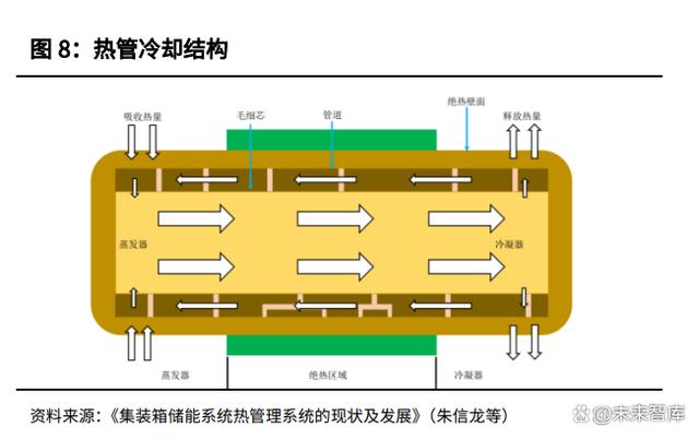 相變材料和熱管冷卻仍處于在研階段,成本和穩(wěn)定性是影響其投產(chǎn)的重要原 因。相變材料冷卻是使電池單體直接接觸相變材料,利用其相變過程吸收熱 量實(shí)現(xiàn)對(duì)鋰離子電池的冷卻。相變材料冷卻可以明顯提升儲(chǔ)能系統(tǒng)溫度分布 的均勻性,但其價(jià)格較高,且當(dāng)相變材料吸熱時(shí),其體積變化明顯,容易對(duì) 儲(chǔ)能系統(tǒng)的工作性能產(chǎn)生影響。熱管是一種利用介質(zhì)在吸熱端的蒸發(fā)帶走熱 量,再在放熱端通過冷凝的方式將熱量傳遞到外界的裝置,這一冷卻技術(shù)已 相對(duì)成熟,但其成本較高,在手機(jī)等電子設(shè)備上使用較多,應(yīng)用于儲(chǔ)能系統(tǒng) 上性價(jià)比低。