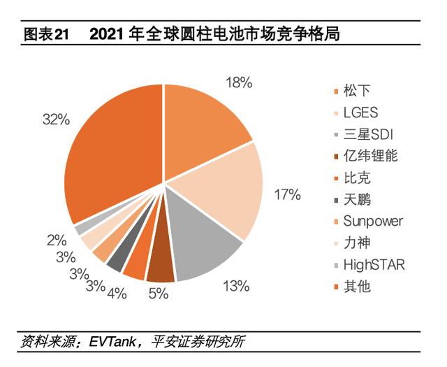 不同于比亞迪的悄悄研究,更多的電池企業(yè)正大張旗鼓地加入大圓柱電池陣營。其中,布局最深、推進最猛的當(dāng)屬億緯鋰能。公司在今年6月公告,三元大圓柱電池已取得未來5年的客戶意向性需求合計約392GWh。同時,公司25年大圓柱電池產(chǎn)能規(guī)劃達200GWh,遠高于寧德時代40GWh的產(chǎn)能規(guī)劃目標。據(jù)EVTank數(shù)據(jù),2021年億緯鋰能圓柱電池市占率僅次于松下、LG和三星SDI,國內(nèi)領(lǐng)先。
