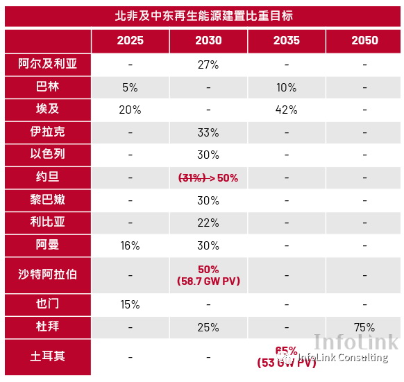 由于既有較成熟市場的商業(yè)模式與供應鏈成型,進入門坎拉高也更為競爭,因此新興市場如東南亞、中東、南美、非洲等成為企業(yè)欲搶占布局之區(qū),且受到光伏市場的刺激會帶動儲能維持熱度與需求,應用面今年則以表后工商業(yè)更受關注。然而,大部分此些市場的政策、程序、供應鏈、再生能源規(guī)模、電網(wǎng)、建設環(huán)境等都遠不如較成熟市場,相對也就需要更長的爬坡期且影響發(fā)展速率變量更多,導致該市場可能大幅起落。例如,新興市場目前出臺的政策多是以整體再生能源建置為目標,對于儲能的需求或發(fā)展尚無明確指引,以下表整理的北非與中東為例;其次,中國六月份的儲能裝機規(guī)模中工商業(yè)占比僅1%,說明市場需求與情緒雖旺盛,但實際規(guī)模需更審慎評估。