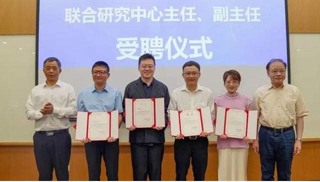 中國科學(xué)院院士馬余剛(左一)、褚君浩(右一)為聯(lián)合研究中心負責(zé)人頒發(fā)聘書