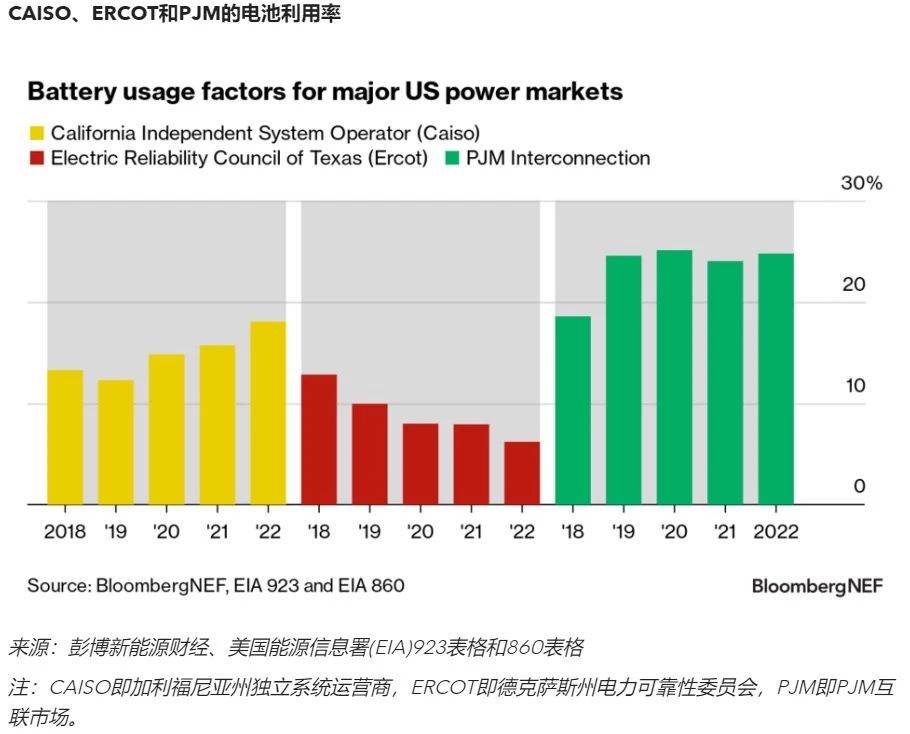 電池利用率受電池使用情況影響,也因地區(qū)而異。對于加利福尼亞州獨立系統(tǒng)運營商(CAISO),由于市場多元化的商業(yè)模式,利用率波動很大;而在德克薩斯州,對于電力可靠性委員會(ERCOT),電池主要提供調(diào)頻服務(wù),因此電池平均利用率較低;在PJM互聯(lián)市場中,電池也主要用于調(diào)頻,但由于市場對電池的循環(huán)需求高,利用率往往相當(dāng)之高。
