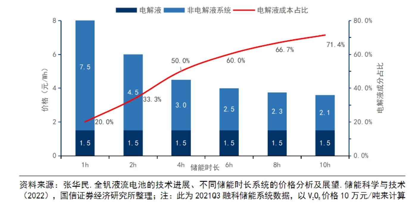 從經(jīng)濟(jì)性上看,全釩液流電池儲(chǔ)能的初始投資成本在2.5元-7.5元/Wh,時(shí)長(zhǎng)越大,單瓦時(shí)的投建成本越低,8小時(shí)以上可以降到2元/Wh左右,接近鋰電儲(chǔ)能。而且,全釩液流電池的壽命長(zhǎng)達(dá)20年,是鋰電池的2倍,這進(jìn)一步攤低了初始投資的單位成本,成本更優(yōu)于鋰電儲(chǔ)能系統(tǒng)。即便是20年壽命到期,釩液流電池電解液的殘值和循環(huán)利用價(jià)值也高達(dá)30%以上,全生命周期成本更低。未來(lái),隨著更多全釩液流電池儲(chǔ)能項(xiàng)目的上馬,很容易在市場(chǎng)層面引發(fā)共鳴。