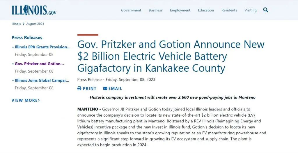 本月初,美國伊利諾伊州政府官網曾發(fā)布消息,宣布國軒高科將斥資20億美元(約147億元人民幣)在該州坎卡基縣曼特諾新建電動汽車電池超級工廠。