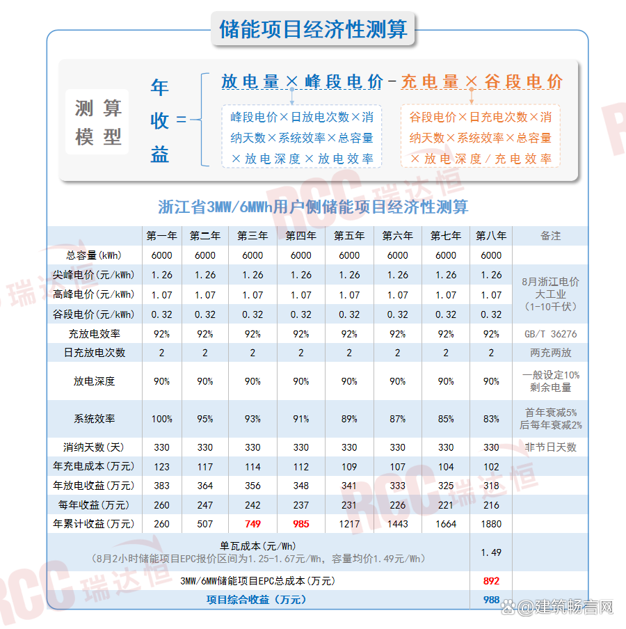RCC瑞達恒研究院基于8月份的電價及儲能項目EPC中標均價等數(shù)據(jù),以浙江省某化纖生產(chǎn)公司3MW/6MW的用戶側(cè)儲能項目為例進行經(jīng)濟性測算得出:該項目約3.5年便可回收項目建設(shè)成本,按項目運行周期8年測算,項目可為業(yè)主節(jié)省988萬元的電費。