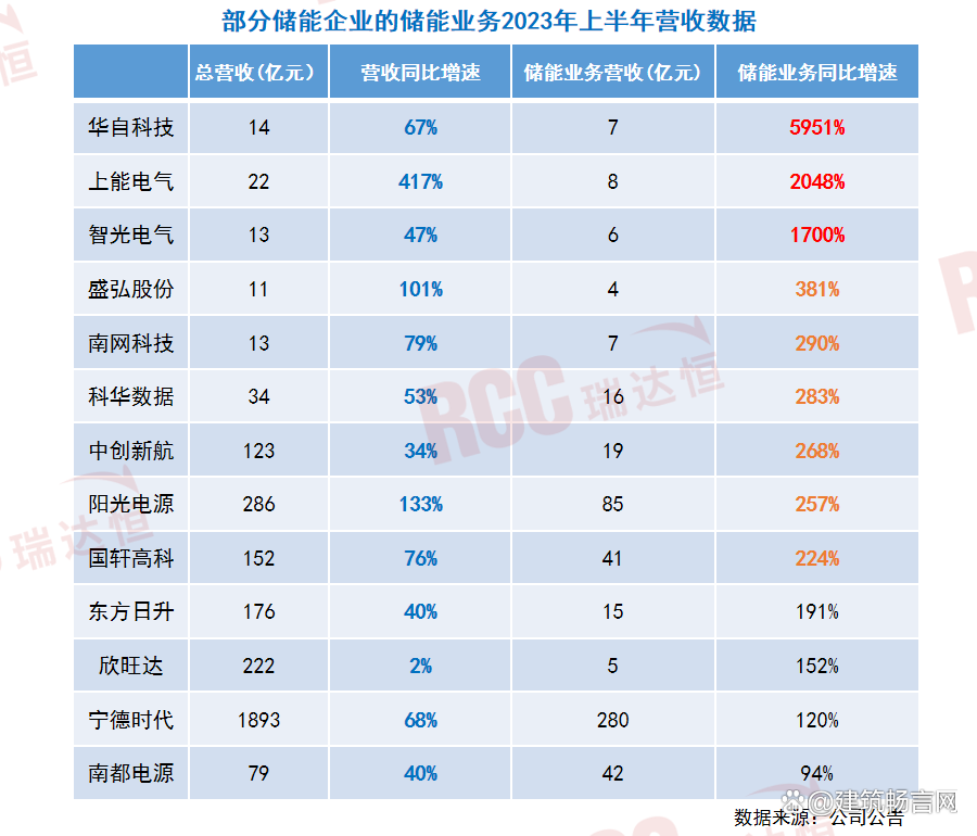 儲能企業(yè)陸續(xù)公布2023年上半年業(yè)績,近7成實現(xiàn)營收正增長,部分企業(yè)迎來儲能業(yè)績大爆發(fā)。華自科技、上能電氣、智光電氣儲能業(yè)務(wù)營收分別同比增長5951%、2048%、1700%。