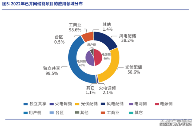 儲能下游的應用場景可分為電源側(cè)(又稱發(fā)電側(cè))、電網(wǎng)側(cè)和用戶側(cè)。據(jù)《2023年中國新型儲能產(chǎn)業(yè)發(fā)展白皮書》統(tǒng)計,從2022年已并網(wǎng)儲能項目應用領(lǐng)域來看,電源側(cè)、電網(wǎng)側(cè)、用戶側(cè)項目分布比例分別是49%、43%和8%。具體來看,光伏配儲和風光配儲又分別占電源側(cè)項目的58.6%和38.2%,也就是配儲合計占電源側(cè)項目的96.8%。