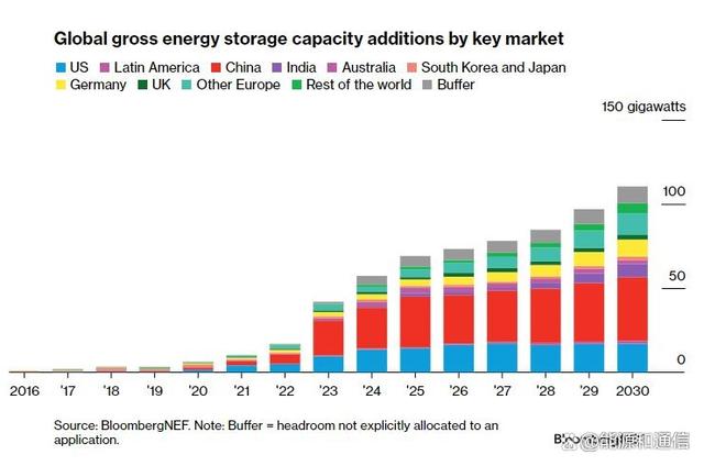 BloombergNEF對全球主要地區(qū)到2030年底的安裝量預測。