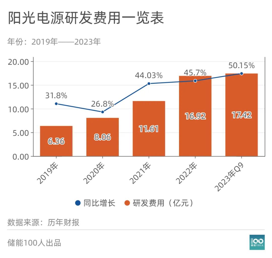 事實(shí)上,陽光電源自1997年成立起,26年來一直不斷加大科研投入,時(shí)刻不忘技術(shù)創(chuàng)新。截至目前,其在合肥、上海、南京、深圳、德國、荷蘭有六大研發(fā)中心,研發(fā)人員占比40%,2023年前三季度研發(fā)費(fèi)用投入17.42億元。申請專利5300余項(xiàng),持有數(shù)業(yè)內(nèi)第一。