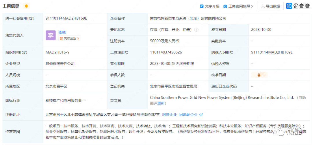 10月30日,南方電網(wǎng)新型電力系統(tǒng)(北京)研究院有限公司注冊(cè)成立,法定代表人為李鵬,注冊(cè)資本5億元人民幣,該公司由中國南方電網(wǎng)有限責(zé)任公司及旗下南方電網(wǎng)數(shù)字電網(wǎng)集團(tuán)有限公司、南方電網(wǎng)科學(xué)研究院有限責(zé)任公司共同持股。