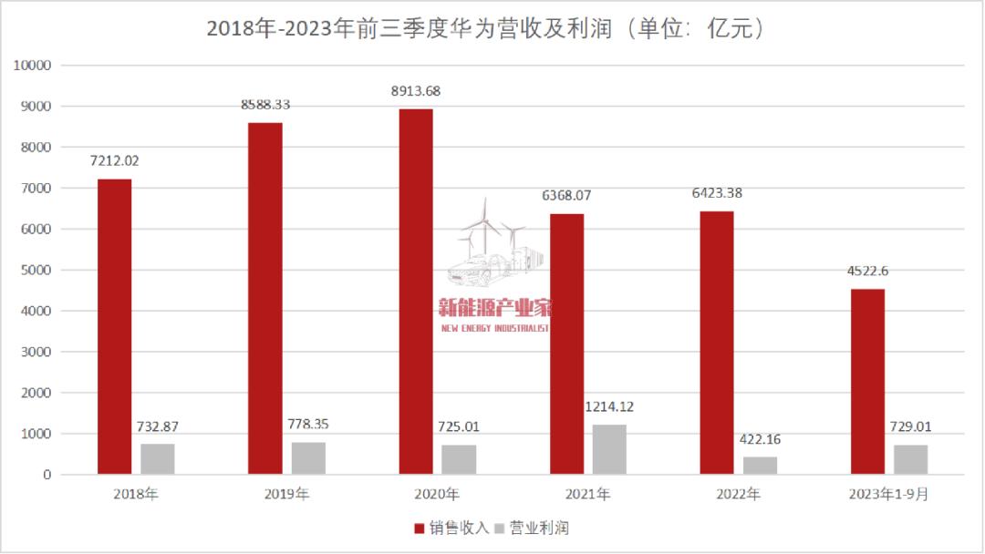 在美國制裁的陰影下,過去數(shù)年,華為的業(yè)務營收一直處在下滑態(tài)勢。2022年,華為銷售收入已經比 2019 年少了 2000 多億元,利潤更在過去五年里減少超過四成。直到今年,才得以扭轉。