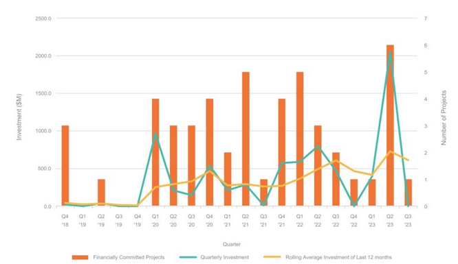 在今年第二季度,包括Waratah Super Battery電池儲能項(xiàng)目在內(nèi)的六個大型電池儲能系統(tǒng)獲得投資承諾,首次在一個季度內(nèi)突破10億澳元大關(guān)。而在今年第三季度,只有一個儲能項(xiàng)目獲得投資,是一個在采礦場部署的太陽能+儲能混合項(xiàng)目。
