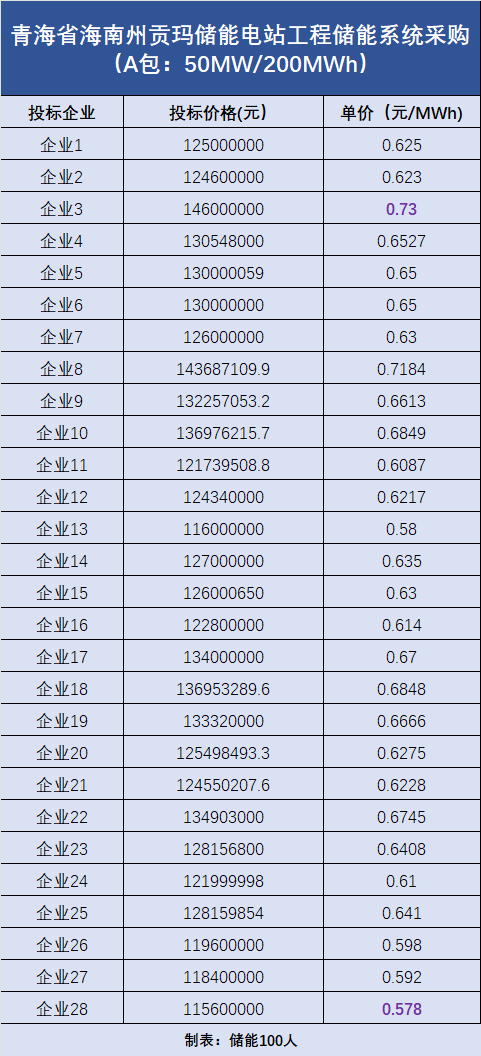A包:容量為50MW/200MWh,共吸引了28家企業(yè)投標(biāo),最低報(bào)價(jià)為0.578元/Wh,最高報(bào)價(jià)為0.73元/Wh。(投標(biāo)報(bào)價(jià)詳情見下圖)