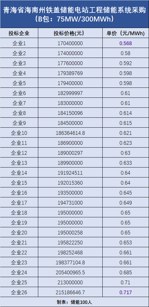 B包:規(guī)模為75MW/300MWh,共吸引了26家企業(yè)投標(biāo),最低報(bào)價(jià)為0.568元/Wh,最高報(bào)價(jià)為0.717元/Wh。(投標(biāo)報(bào)價(jià)詳情見下圖)