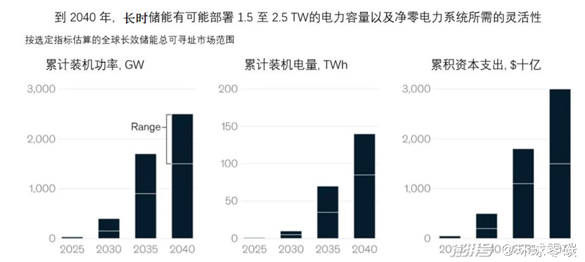 2021年,全球知名咨詢(xún)公司麥肯錫和長(zhǎng)期儲(chǔ)能協(xié)會(huì)(LDES)發(fā)布的一份報(bào)告表示,到2040年,LDES 有可能在全球部署 1.5 至 2.5 TW)(太瓦)的裝機(jī)容量,是當(dāng)前部署的總儲(chǔ)能容量的8到15倍。對(duì)應(yīng)的儲(chǔ)能容量是 85-140TWh)(太瓦時(shí) )。