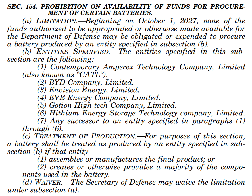 報(bào)道稱,根據(jù)美國去年年底通過的2024財(cái)年國防授權(quán)法案,美國國防部將被禁止從寧德時(shí)代、比亞迪、遠(yuǎn)景能源、億緯鋰能、國軒高科、海辰儲能等6家中國企業(yè)采購電池。該禁令將于2027年10月生效。不過,這項(xiàng)禁令并不適用于商業(yè)采購,比如美國福特公司正從寧德時(shí)代獲得技術(shù)許可,在密歇根州生產(chǎn)電動汽車電池,特斯拉公司的部分電池也來自比亞迪。