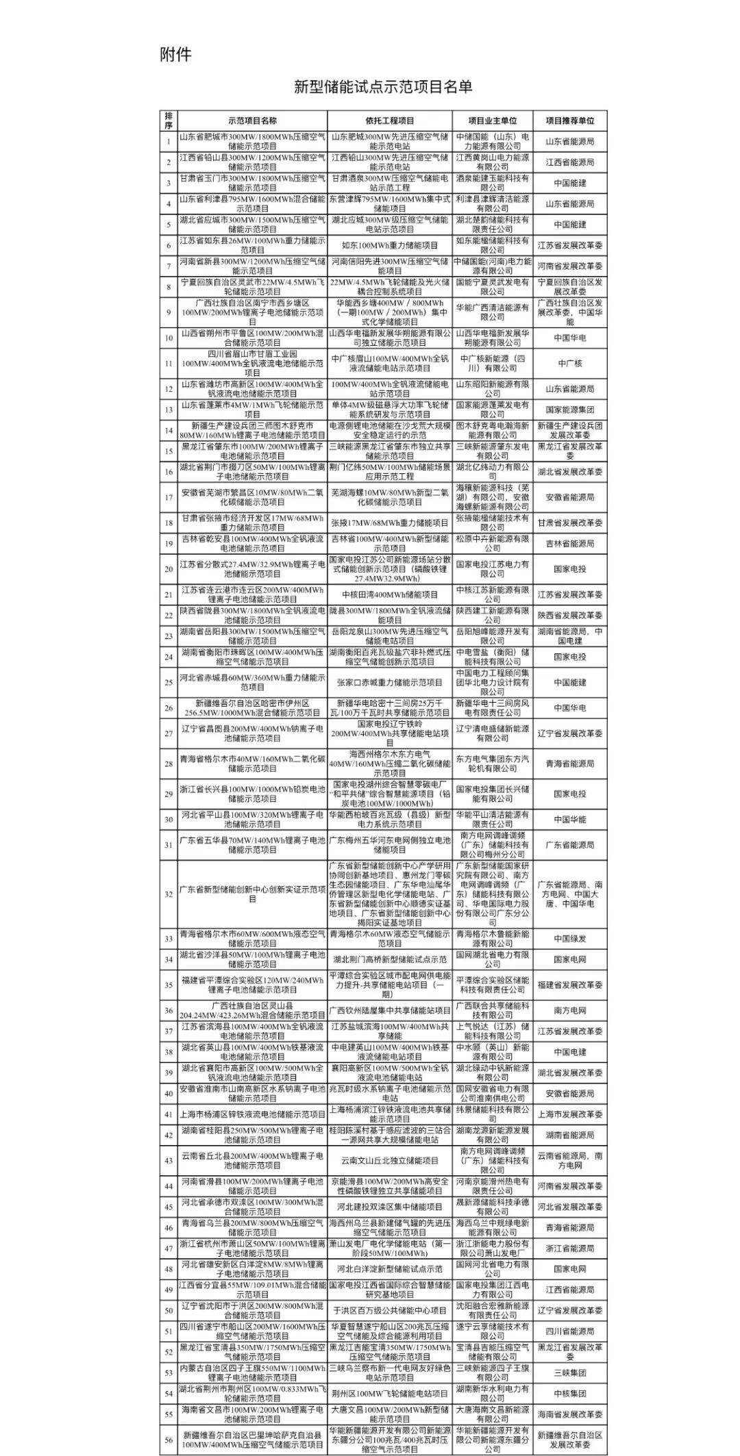 一、經(jīng)項目單位申報,有關(guān)省級能源主管部門和中央企業(yè)匯總推薦,國家能源局組織專家評審,并公示征求各方面意見,決定將“山東省肥城市300MW/1800MWh壓縮空氣儲能示范項目”等56個項目列為新型儲能試點示范項目。
