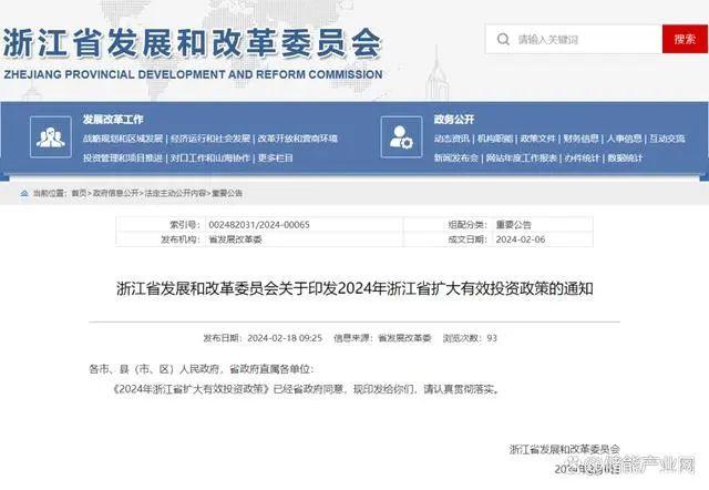 2月18日,浙江發(fā)改委官網(wǎng)發(fā)布關于印發(fā)2024年浙江省擴大有效投資政策的通知。