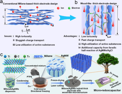圖3.a) 具有密堆積結(jié)構(gòu)的傳統(tǒng)MXene厚電極設(shè)計(jì)與b)具有類木質(zhì)微結(jié)構(gòu)的MXene/AgNWs混合厚電極設(shè)計(jì)在結(jié)構(gòu)和功能上的優(yōu)勢(shì)比較;c) 類木MXene/AgNWs混合厚電極的制備過程和微型氧化還原電容器的組裝示意圖。
