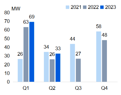 美國工商儲現(xiàn)狀:根據(jù)Wood Mackenzie數(shù)據(jù),2023H1,美國新增工商儲裝機累計達101.6MW/310.3MWh,同比+14.3%/+53.7%。據(jù)該機構(gòu)預測,后續(xù)供應鏈的挑戰(zhàn)和各州相關(guān)政策的缺乏會對工商儲安裝造成沖擊。