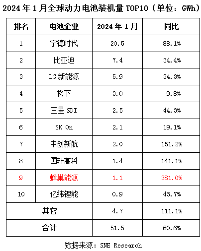 勢(shì)頭強(qiáng)勁 蜂巢能源1月全球動(dòng)力電池裝機(jī)量排名升至第9