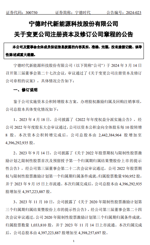 近日,寧德時(shí)代發(fā)布《關(guān)于變更公司注冊(cè)資本及修訂公司章程的公告》。