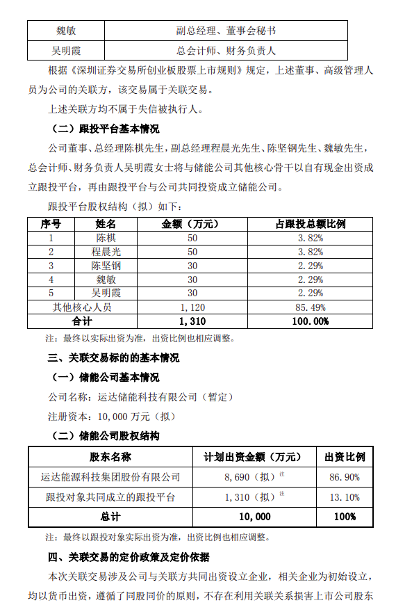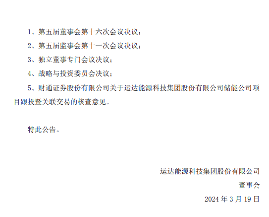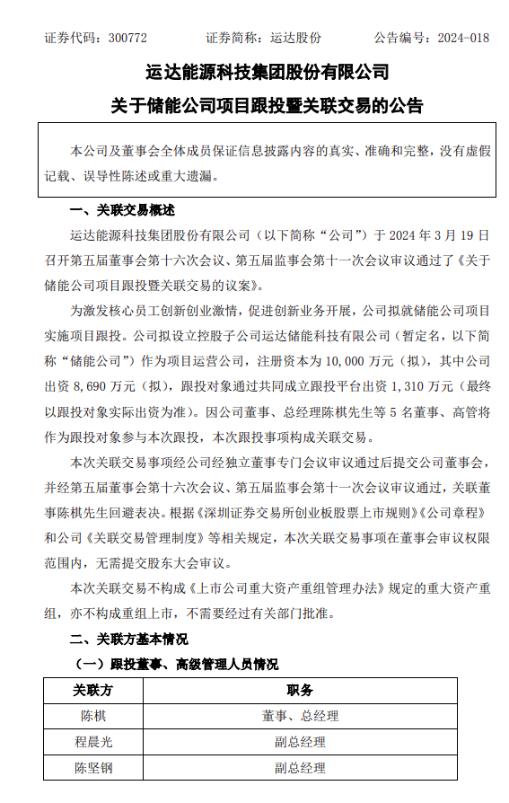 3月19日,運達股份發(fā)布《關于儲能公司項目跟投暨關聯(lián)交易的公告》。