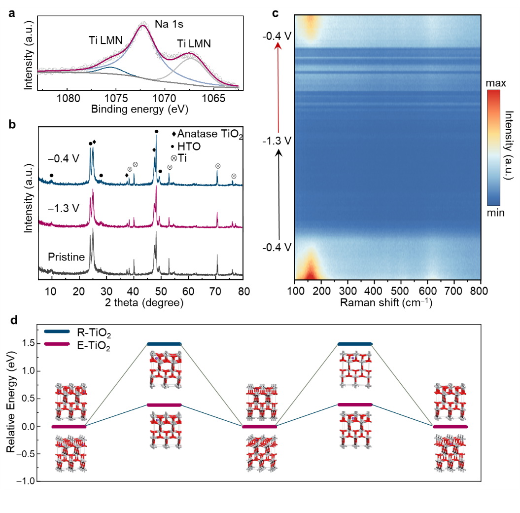 圖4:E-TiO2的鈉離子嵌入行為分析。(a)鈉離子嵌入后的XPS分析;(b)非原位XRD;(c)原位拉曼;(d)擴(kuò)散路徑與擴(kuò)散能壘。
