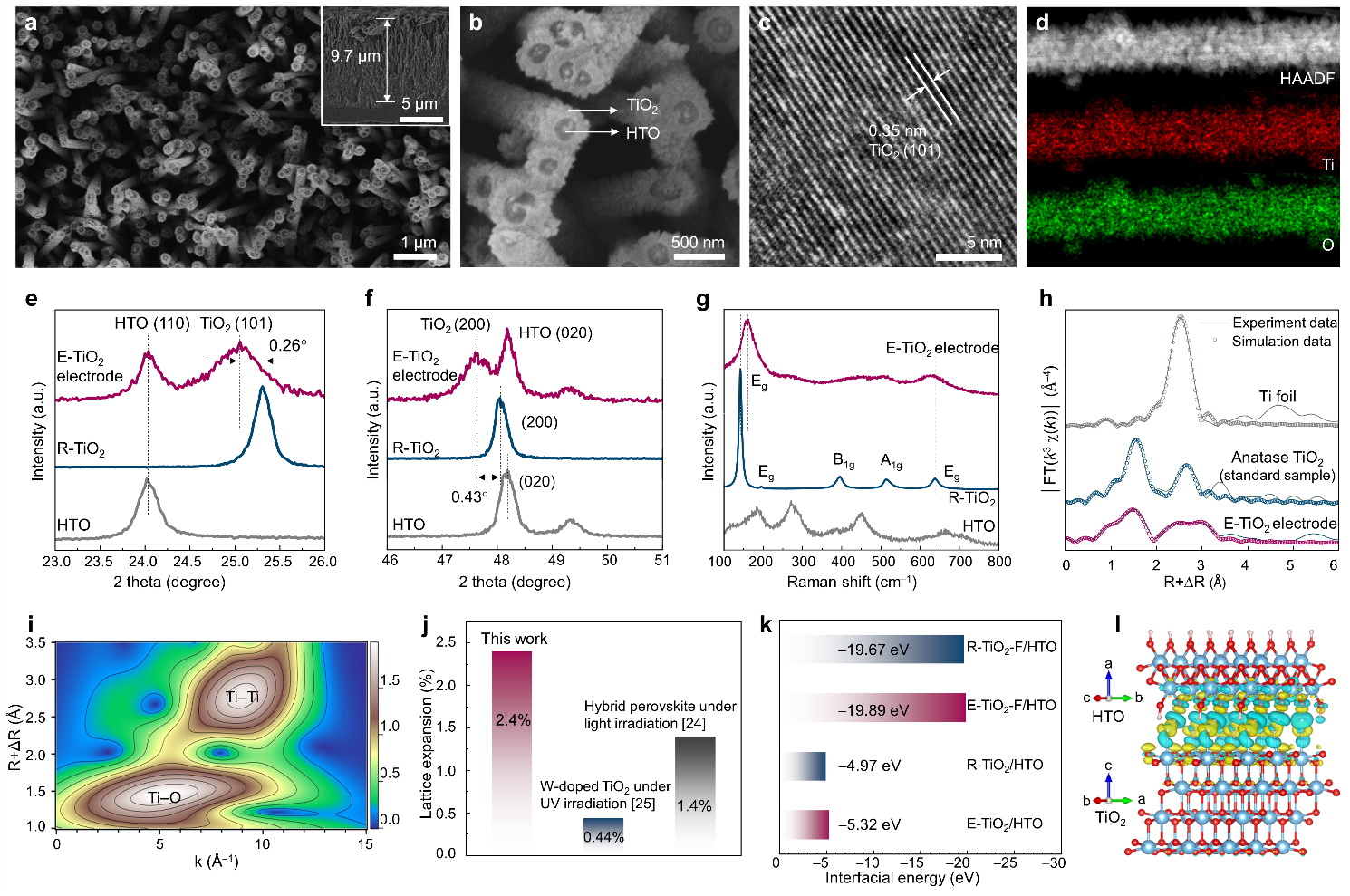 (h)Ti K-edge的FT-EXAFS圖譜;(i)WT-EXAFS譜;j)與文獻(xiàn)中的晶格膨脹數(shù)值及方法對(duì)比;(k)界面能分析;(l)E-TiO2-F/HTO界面電荷密度差分析。