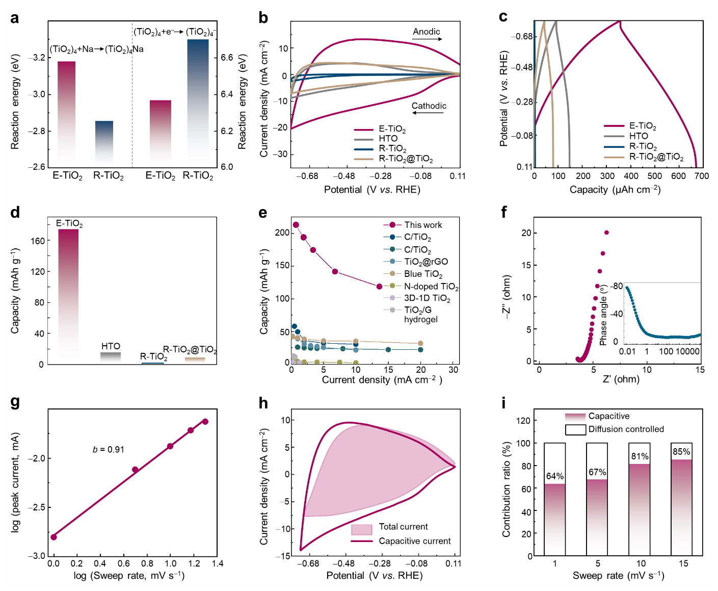 (f)晶格膨脹二氧化鈦的EIS結(jié)果;(g)b值;(h)電容/擴(kuò)散行為分析;(i)不同掃速下電容與擴(kuò)散控制對(duì)容量的貢獻(xiàn)率。