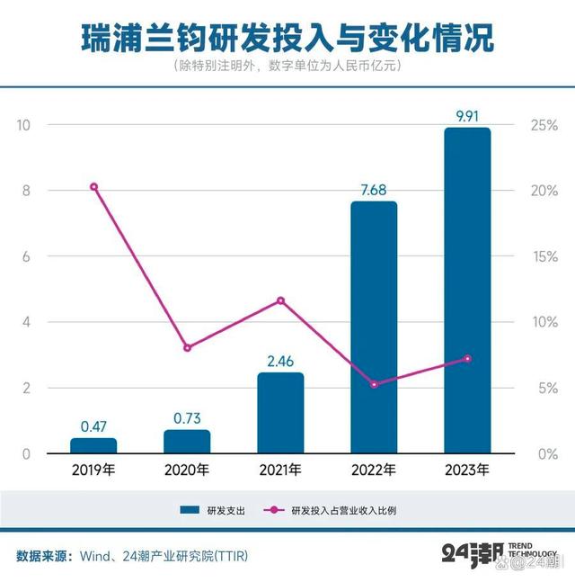 而瑞浦蘭鈞的技術突破與持續(xù)且強力的研發(fā)投入有很大關系。24潮產業(yè)研究院(TTIR)分析發(fā)現,近幾年瑞浦蘭鈞研發(fā)投入一直保持增長趨勢,2023年其研發(fā)支出為9.91億元,同比增長了29.04%,研發(fā)投入占營業(yè)收入比例由2022年的5.24%提升至2023年的7.20%。
