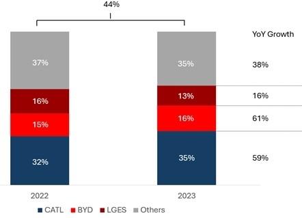 2023年全球電動(dòng)汽車電池裝機(jī)容量同比增長44%,寧德時(shí)代和比亞迪作為中國電池制造商的代表,拿下了超過三分之二的市場份額,其中寧德時(shí)代是最大的受益者。